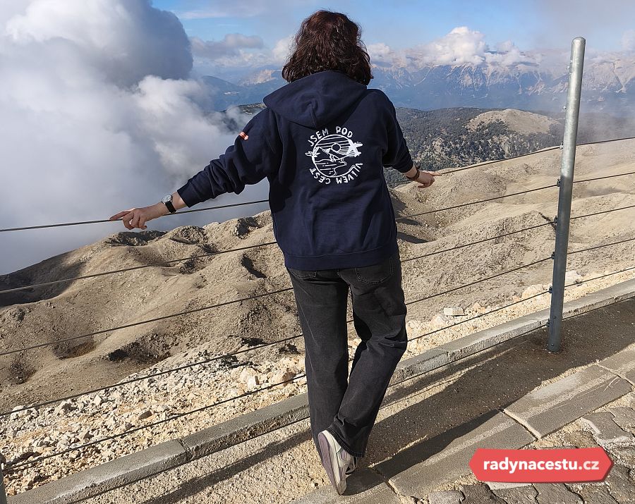 Na vrcholu na vás čeká menší zázemí – kavárna, obchůdek se suvenýry a především vyhlídkové plošiny. Počasí nám tentokrát úplně nepřálo a část panoramatu zahalily mraky. I tak jsme si ale ten okamžik nenechali ujít a pořídili alespoň jednu společnou fotografii. Kdo ví, jestli se na podobné cestě ještě někdy potkáme.