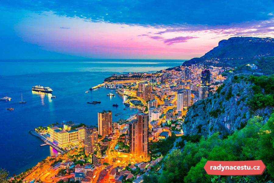 Pohled na Monako po západu slunce, kdy město září večerní atmosférou