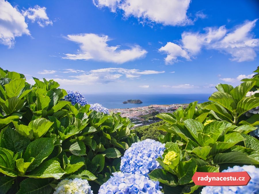Rozkvetlé modré hortenzie lemující cestu na ostrově São Miguel, Azory