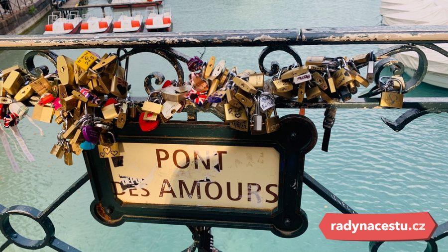 Jedním z nejznámějších míst u jezera je Pont des Amours, Most zamilovaných. Spojuje parkové promenády na břehu jezera a nabízí jeden z nejhezčích výhledů v Annecy: na staré město, na vodu kanálů i na hory v dálce.