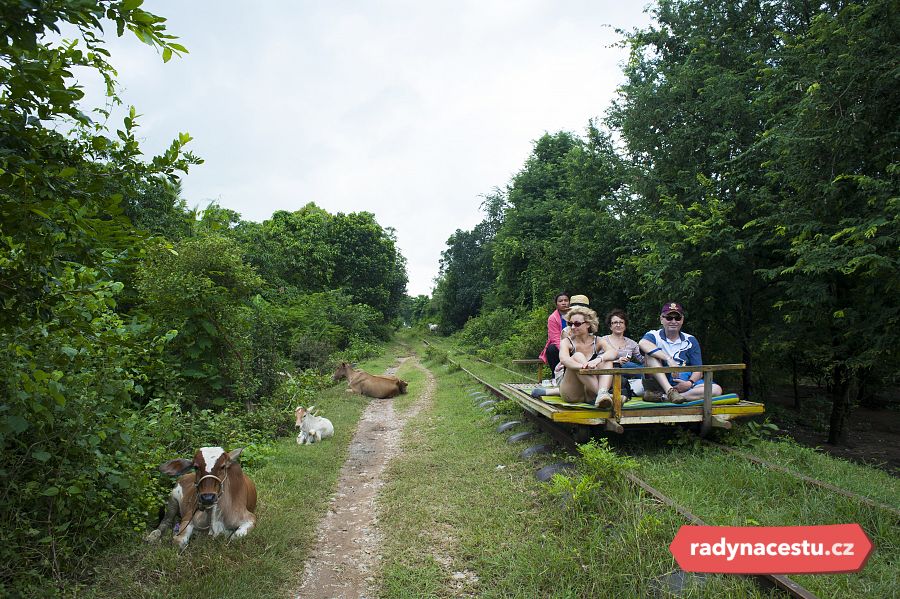 Nicméně během Pol Potovy vlády zůstaly koleje nevyužívané. A tak vznikl prostor pro improvizaci místních obyvatel, kteří nelenili a vytvořili toto vozítko. Na koleje se položí čtyři kola, bambusový rám a motor převážně z motorky a už se může vyrazit. A co se stane, když se potkají dva vláčky proti sobě?