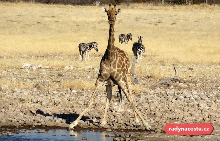 Neděle 26. července: Dnešek věnujeme divoké namibijské přírodě. Vyrazíme na celodenní safari do jižní části národního parku Etosha. Budeme pozorovat žirafy, zebry, antilopy a další typické savce Afriky.