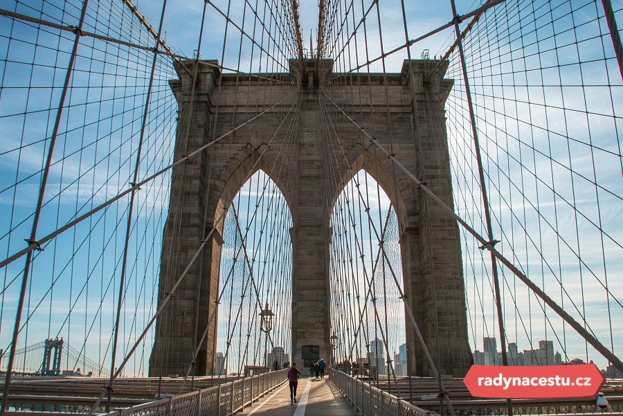 Ikonický Brooklynský most spojující Manhattan a Brooklyn nad řekou East River v New Yorku