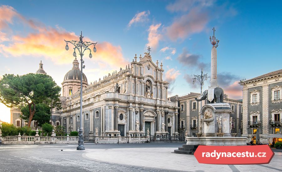 Náměstí Piazza del Duomo s katedrálou sv. Agáty a významnou sloní kašnou v Katánii na Sicílii