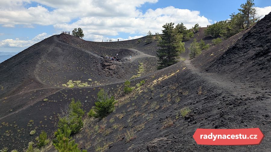 Procházka po lávových polích v blízkosti vulkanických kráterů Etny na Sicílii