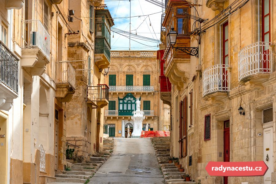 Poklidná atmosféra úzkých uliček Vittoriosy ve Vallettě s tradičními maltskými balkóny